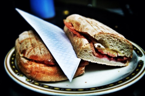 I ordered the bacon, Brie, and cranberry sauce panini, which was served hot off of the panini press and straight over the counter to me with a smile by “Neal” himself. I carried it outside, where my flatmates and I enjoyed a little bit of the people-watching and some absolutely mind-blowing, wow-inducing sandwiches.